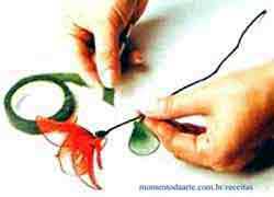 11. Colocação das folhas:Posicione as folhas (2 ou 3) e fixe-as com a fita Floral Verde,