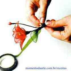 15. Pegue uma flor e 1 ou 2 botões prontos e junte-os pelos cabos.