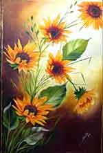 Lista de Materiais: do Quadro com Textura Lateral Dourada • Tela com 70x50 cm • tintas a Óleo: Terra Siena Queimada, Amarelo Nápoles Claro, Sombra Queimada • tintas a Óleo: Amarelo Indiano, Verde Vessie, Verde Oliva e Azul Real • Papel de Découpage (ou guardanapo de Girassóis) e Termolina Leitosa