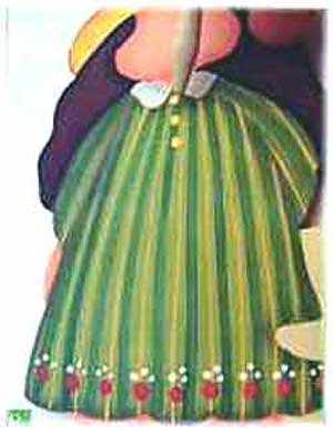 7. Com o pincel E60-2 e a mistura de verde esmeralda com verde oliva, pinte as listas do vestido no sentido vertical, usando a lateral do pincel.