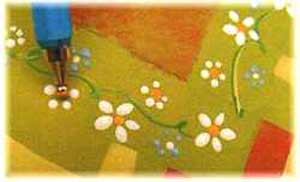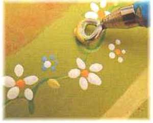Segure o boleador de aro na vertical, mergulhe sua ponta na tinta branca e imprima as pétalas das flores.