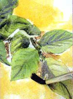 8. Com o pincel nº 8 e o marrom escuro, vá sombreando apenas o contorno das folhas e dos caules.