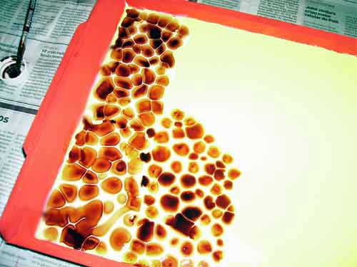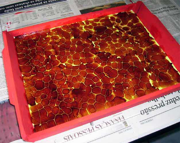 - As gotas de verniz se dissolvem na cola aos poucos e vão se espalhandoEm minutos, as gotas já formam o efeito craquelê.